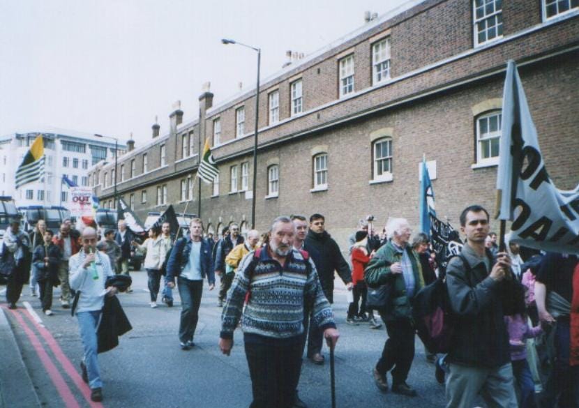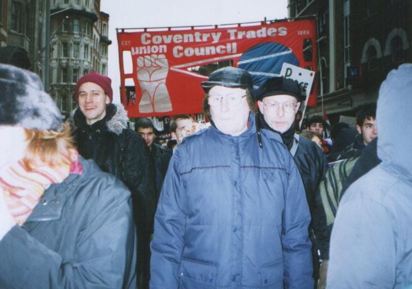 I found out about anti-war meetings taking place at the Koko Building, well-known in left-wing circles, in the Arches Industrial Estate, Spon End. Coventry Trades Union Council was based in this building and could have been the ones who organised the coaches down to London. These meetings had been organised by the Socialist Workers' Party (SWP), though I only became aware of that from the first meeting that I attended. In addition to them was the two-man contingent from the local Marxist Party and others besides myself who were non-aligned. Dave Nellist and his Socialist Party (SP) colleagues were holding another anti-war meeting in a different room, such was and remains the rivalry on the political left.