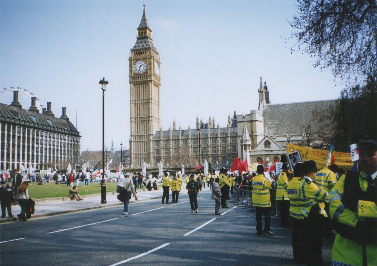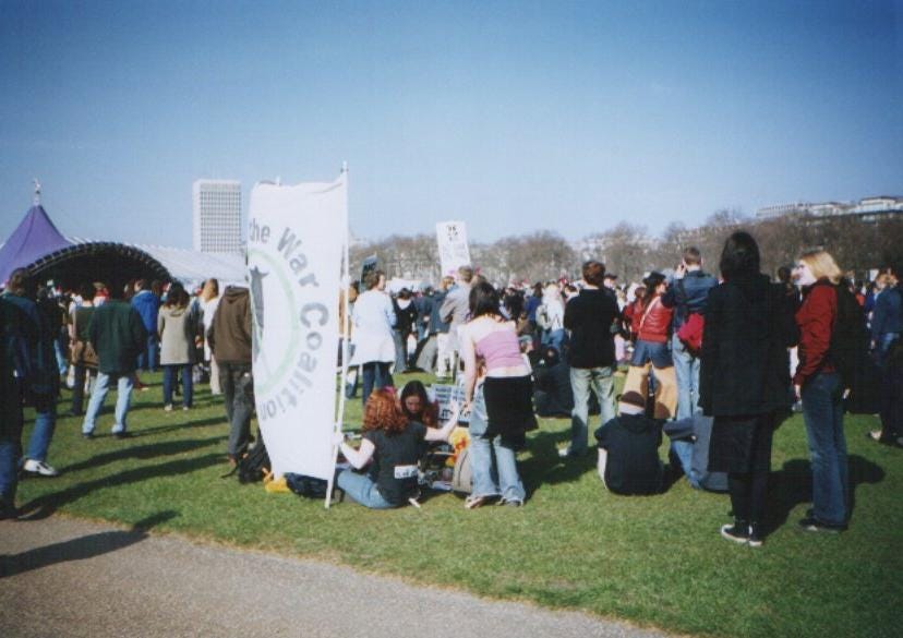 At the first protest in London, just because of the scale of numbers of protestors, the police were courteous. By the time of the next protest five weeks later the atmosphere had changed. There were fewer people, with a greater visibility of Stop The War Coalition and Socialist Worker placards and a somewhat hostile attitude from the police. I had also picked up a sense from attending the anti-war meetings in Spon End that the SWP were looking to control opposition to the war in Iraq and one of their main organisers, the bloke who chaired the meetings, admitted to me that he wanted to get recruits out of it. I told him that my politics leaned more towards the Green Party. His response I think was along the lines of I know you're not a socialist but ... or something to that effect.