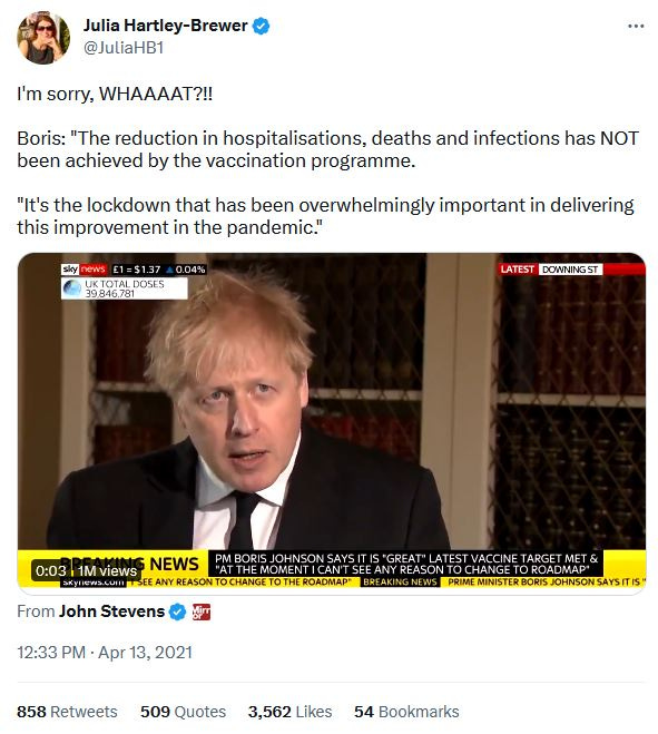 Finally, Boris Johnson yesterday claimed that the 'reduction in hospitalisations, deaths and infections has not been achieved by the vaccination programme', rather it has been due to the Lockdown. This has been met with incredulity by many in the media who have supported the 'vaccination' agenda, not least those who have - or who have claimed to - taken one of the 'vaccines'. In reality the stated reduction is due to neither Lockdown nor the experimental 'vaccines', nor is it to do with testing or mask-wearing, because COVID19 is just yet another normal, seasonal respiratory illness, harmless to the vast majority of the population. Boris Johnson's statement may indicate the government is not currently expecting 'vaccine' uptake to be any higher than it currently is, based upon the inflated figures being published. However come the Autumn, expect the narrative to change again with the 'vaccines' being given a further push.